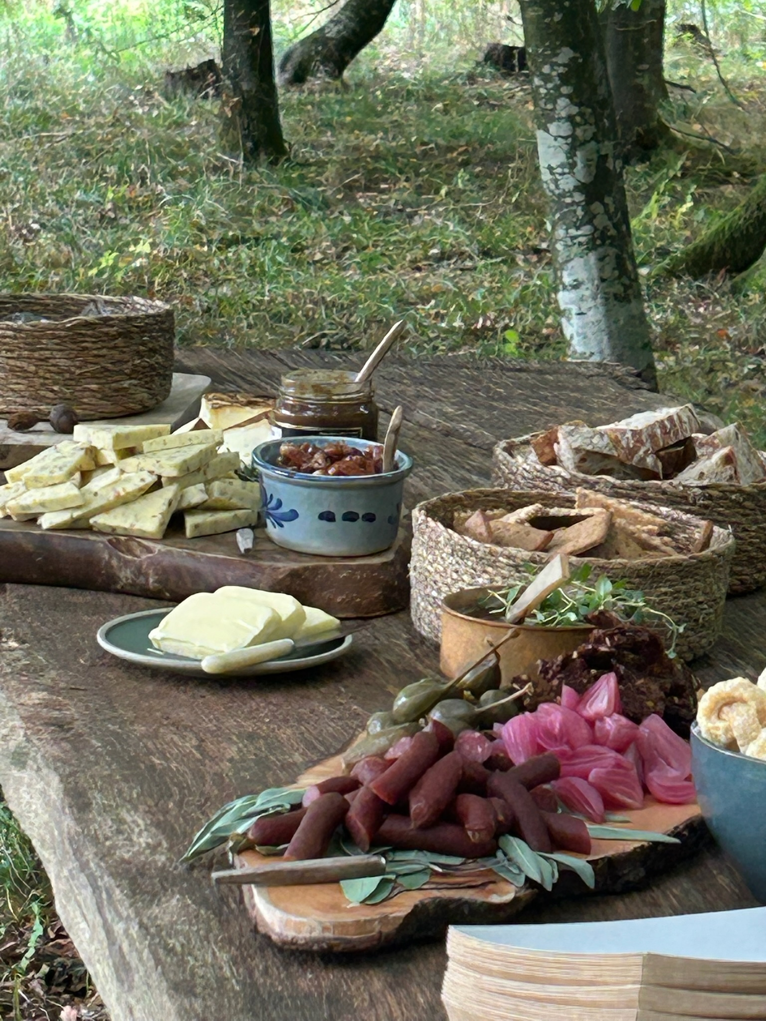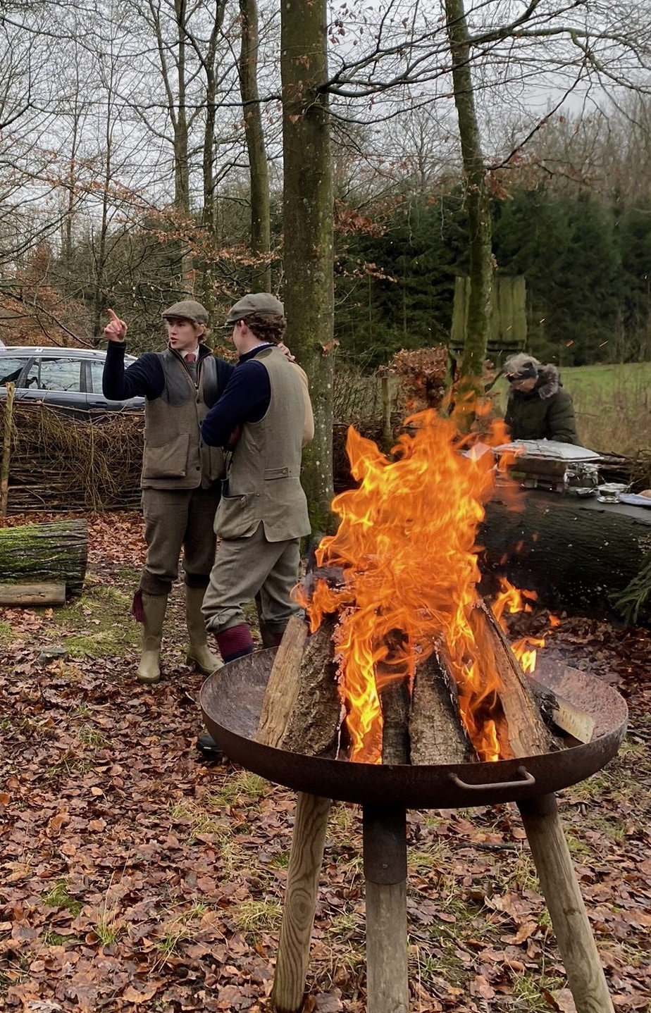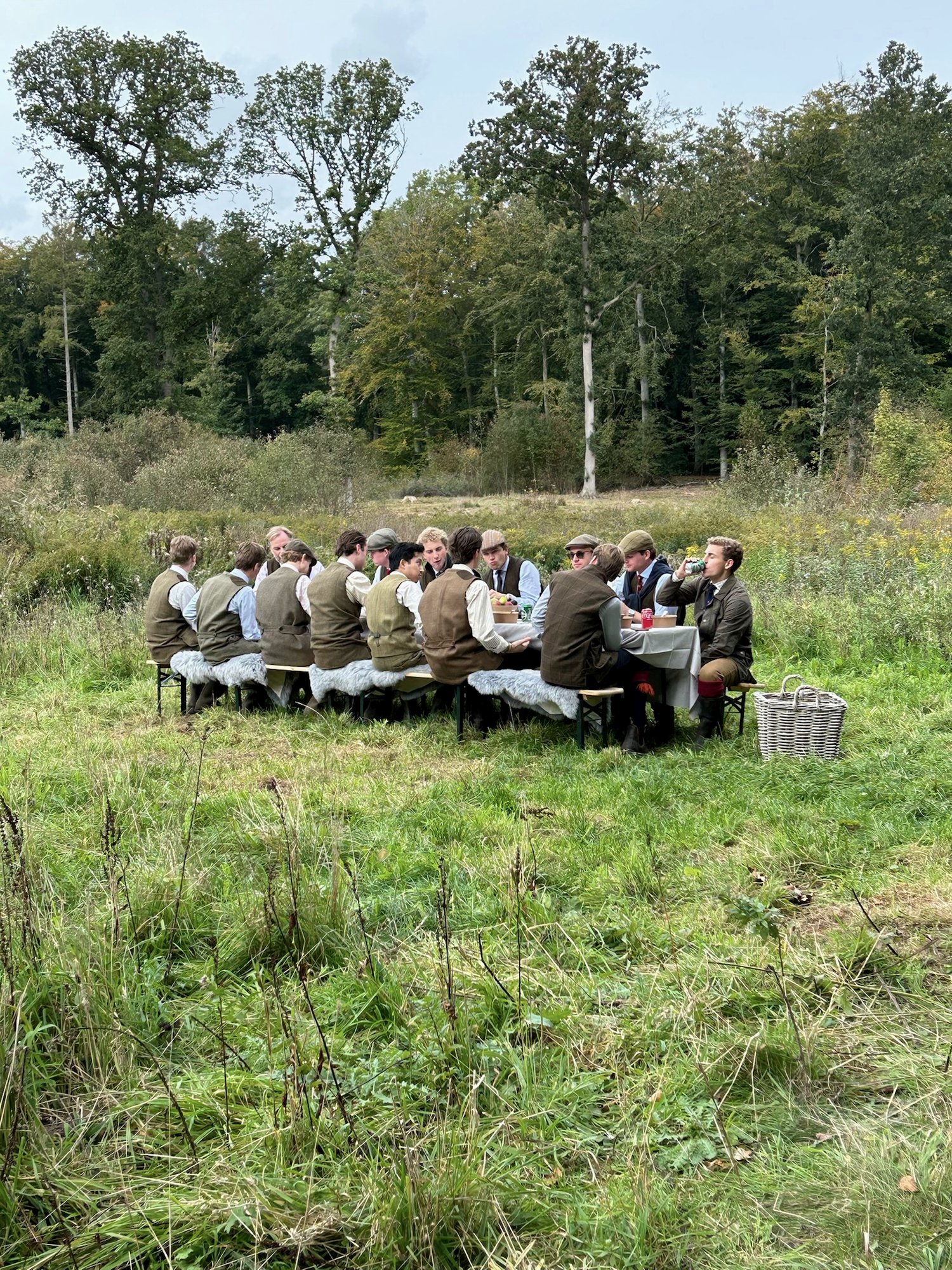 Foran Hovedbygningen. Der serveres Sloe Gin eller Portvin. Dagen præsenteres af værten og/eller godsets skytte.