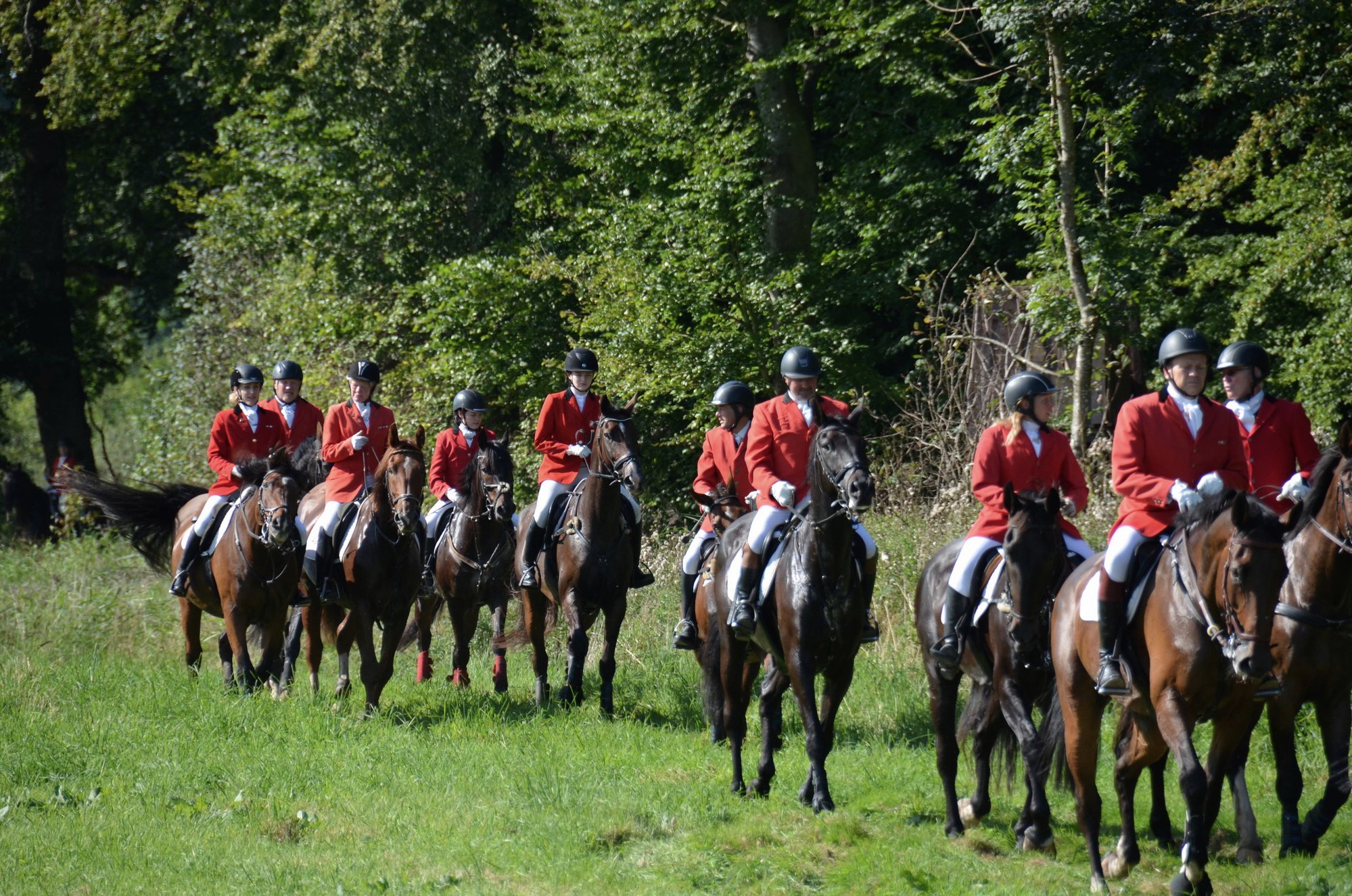 Foran Hovedbygningen. Hornblæser blæser jagten af.